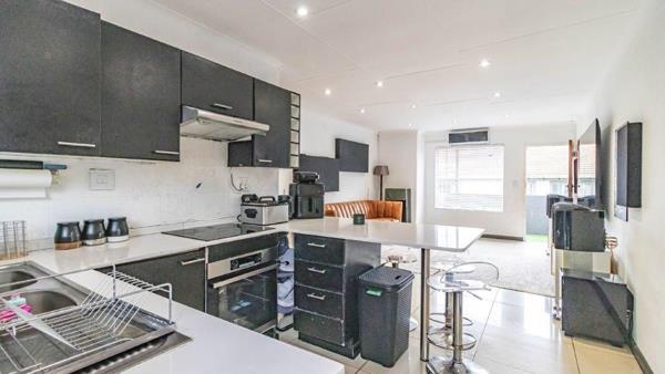 As you step inside, you are welcomed by a spacious open-plan kitchen and lounge area. The modern kitchen offers ample cupboard space, Caesarstone countertops, a four-plate electric stove, an electric undercounter oven, and space for your essential appliances.