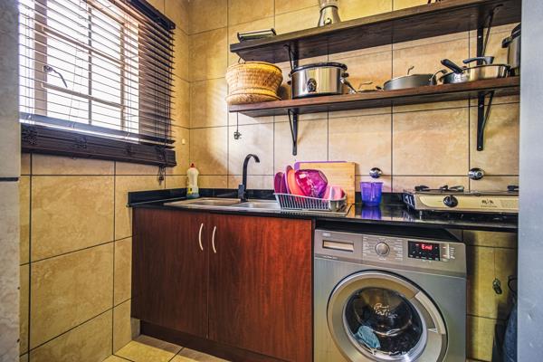 This well-maintained first-floor unit offers comfortable and modern living in a secure complex. The home features an open-plan tiled lounge and kitchen, creating a welcoming and practical living space. The kitchen is fitted with granite countertops, built-in cupboards, a four-plate stove, extractor fan, oven, and a double basin, with walls tiled to the ceiling for a clean, modern finish.