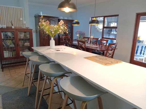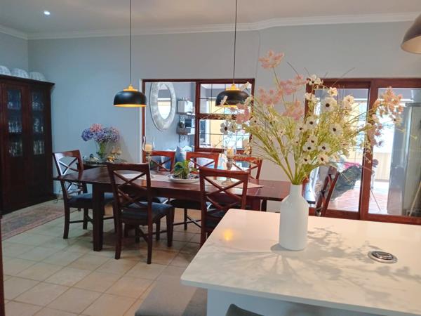 The covered patio is fitted with folding stacking doors, allowing it to double as a sunroomperfect for year-round enjoyment. In addition, a large second patio with a built-in braai leads off the dining room, creating an excellent space for entertaining and outdoor dining.