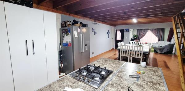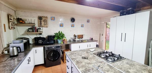 The kitchen is modern and has a large island with a gas hob. There is a large central dining room and a cosy lounge leading out to a lush garden with water feature and braai.