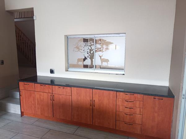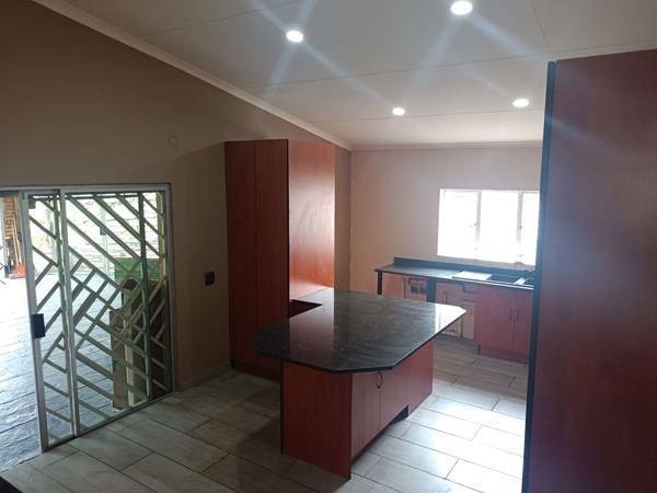 The recently updated kitchen offers ample cupboard space and opens onto a large entertainment area with a built-in braai, flowing out to a neat garden with fruit trees.
