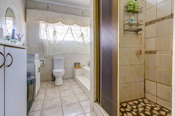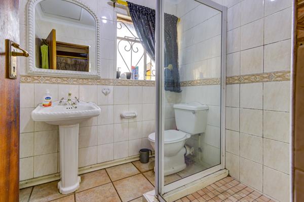 Five bedrooms branch off the central passage like private suites in a boutique lodge. Each is carpet-soft underfoot, lined with built-in cupboards, and generous in scaleyet the main suite reigns supreme. It stretches luxuriously toward the garden and claims its own full en-suite: bath for long soaks, separate shower for brisk mornings, basin and toilet framed by neutral tiles. Down the hall, a family bathroom mirrors its elegance, and an additional guest cloakroom with shower ensures no queue is ever too long on busy school mornings.