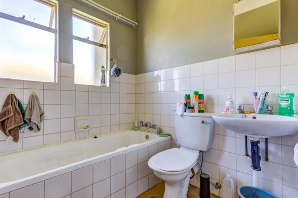 The unit offers 2 very spacious bedrooms finished with tiled floors and built-in cupboards. It also offers 1 bathroom, half tiled, with a bath, basin and toilet.