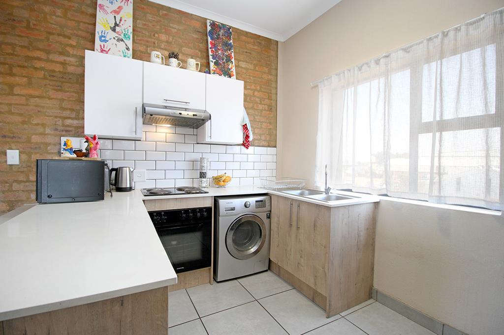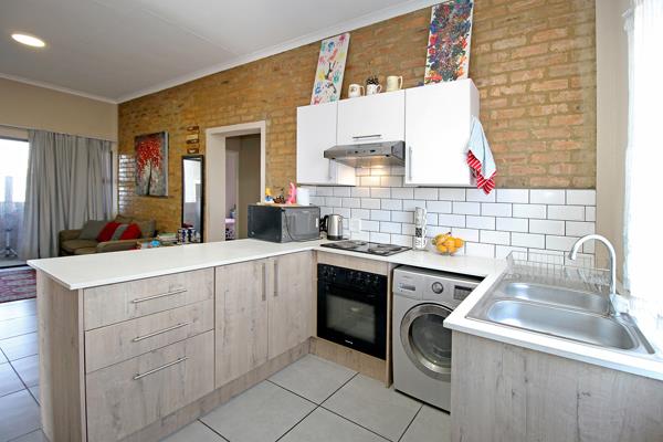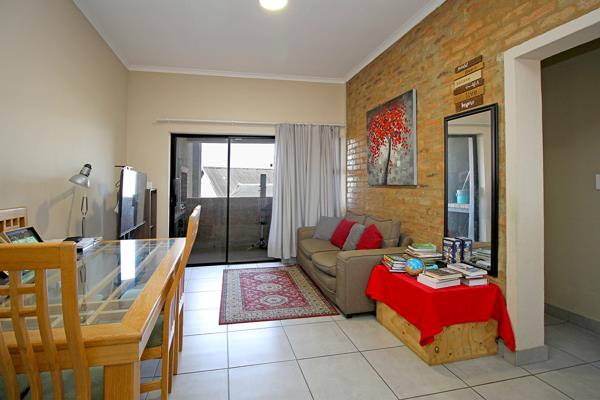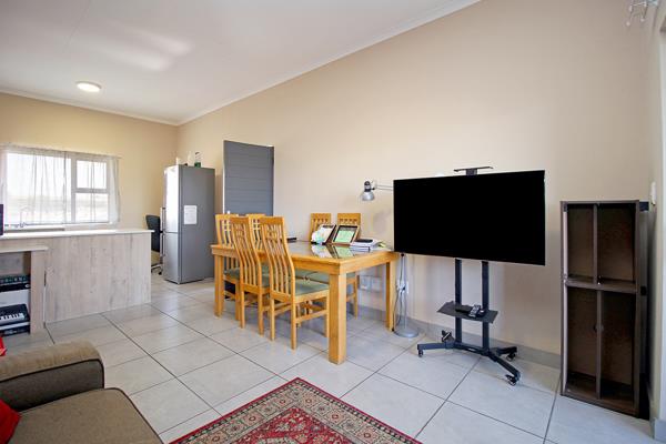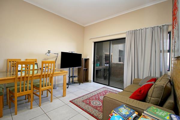 The unit features 2 generously-sized bedrooms and a full bathroom, complete with both a bath and shower. The modern kitchen boasts stylish granite countertops, a hob, and ample cupboard space, making meal preparation a breeze. The open-plan lounge and dining area, with tasteful tile flooring, flows seamlessly onto a private balcony, which includes a built-in braai for outdoor entertaining.