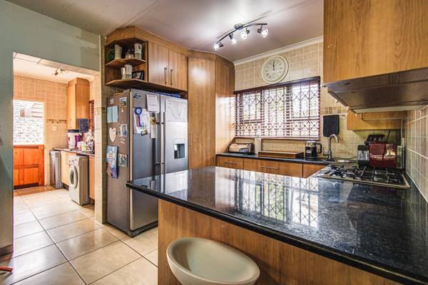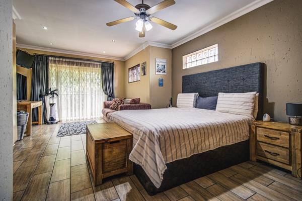 The generous open-plan living and family areas flow seamlessly through glass sliding doors onto a covered patio complete with a built-in braai overlooking a sparkling solar-heated pool and landscaped private garden.