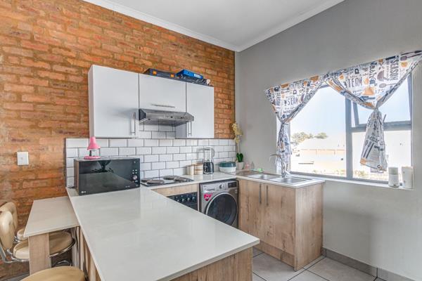 Discover this contemporary 70 sqm apartment in Pomona, Kempton Park, offering a stylish and functional living experience. The open plan layout seamlessly connects the living area with the modern kitchen, creating an inviting atmosphere. Exposed brick accent walls throughout the main living spaces add character, complemented by durable tiled flooring.