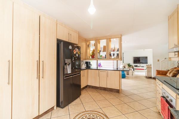At the heart of the home lies a beautifully designed, open-plan kitchen that blends style with practicality. Featuring granite countertops, generous cupboard space and elegant display cabinets, this kitchen caters perfectly to the needs of a modern family. A cosy breakfast nook provides the perfect spot for busy mornings or relaxed coffee moments.