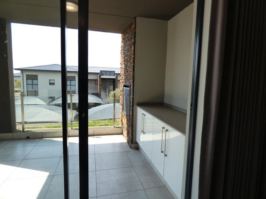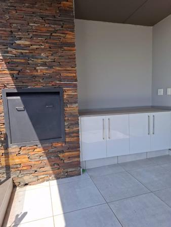 Step outside to a private balcony, an ideal space for relaxation and entertaining. This outdoor area features a stylish built-in braai set against a stacked natural stone wall, complemented by a practical cabinet unit with a countertop. As part of a premier golf and security estate, residents benefit from exceptional amenities including a communal pool, a well-equipped gym, and a club house, all within a pet-friendly environment. Two dedicated parking spaces are provided.
