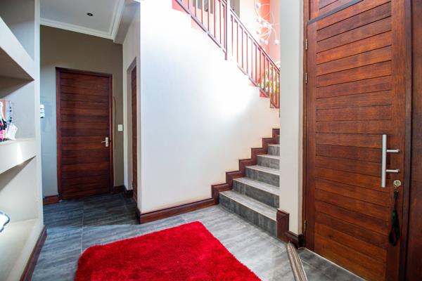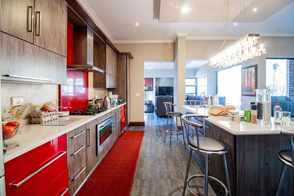 Discover your ideal family home with this imposing corner property in a serene cul de sac. This spacious residence features double doors leading into a large open-plan area that seamlessly connects to the large kitchen, complete with fitted appliances, a central island, and an adjacent tv area perfect for family gatherings. The open plan design also includes a dining area and formal lounge, both opening out to the garden and entertainment spaces. Enjoy outdoor living with a dedicated braai area and pool on a charming wooden deck ideal for entertaining.