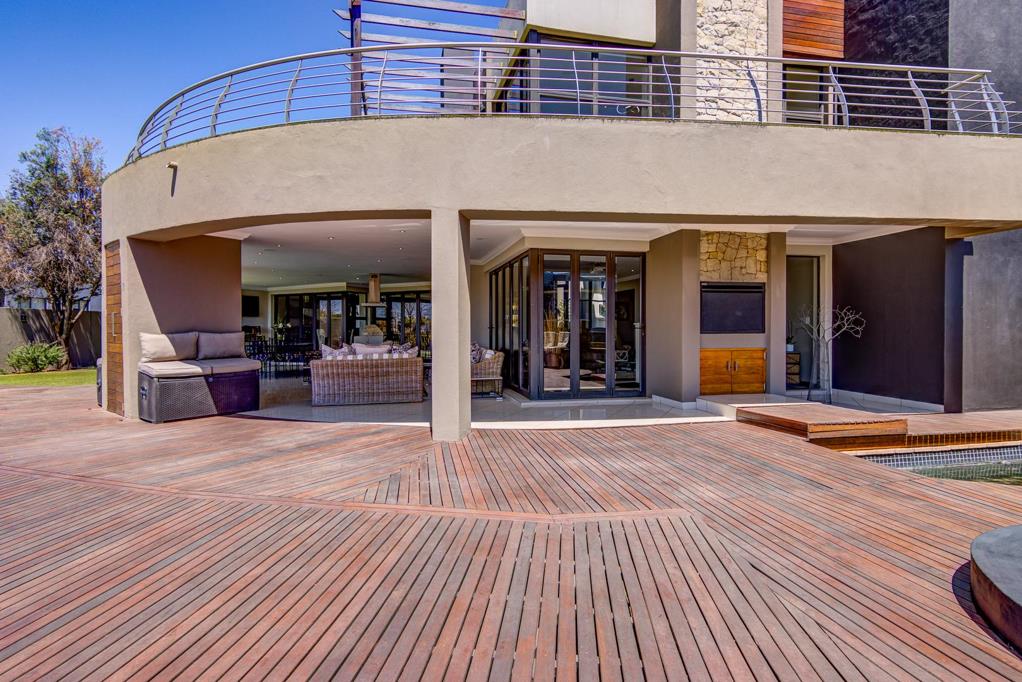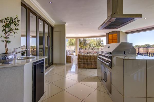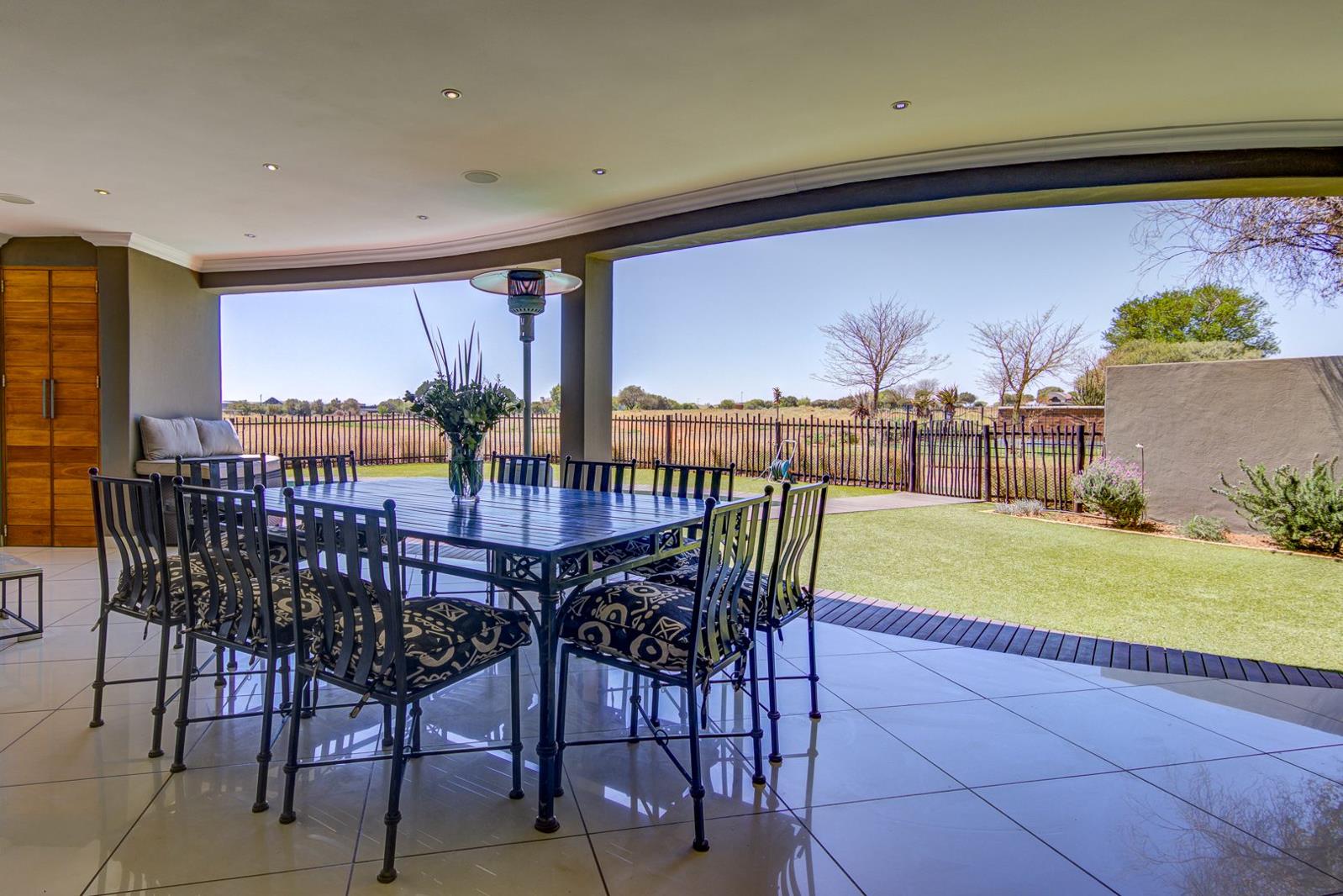 The patio is huge, spacious, has a gas braai station, two or three seating area''s and this all leads onto a garden , swimming pool, jacuzzi and a boma area. Lovely view of the 15th and 16th par three holes. There is also a large Koi fish pond.