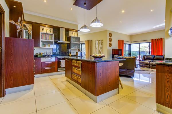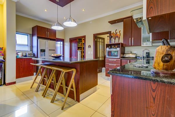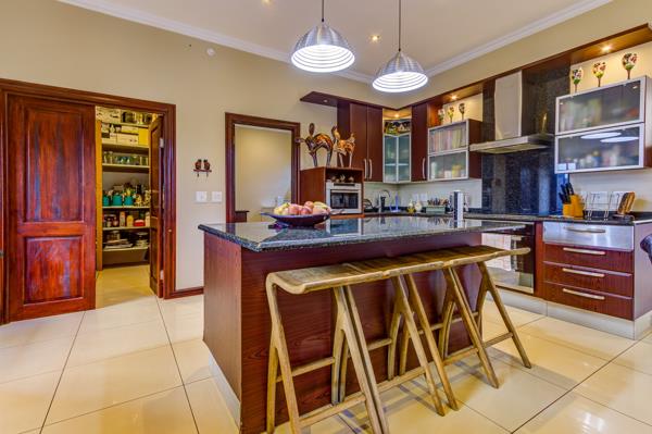 The open-plan gourmet kitchen, fitted with sleek modern finishes, boasts a central island, walk-in pantry, and an impressively spacious separate scullery.