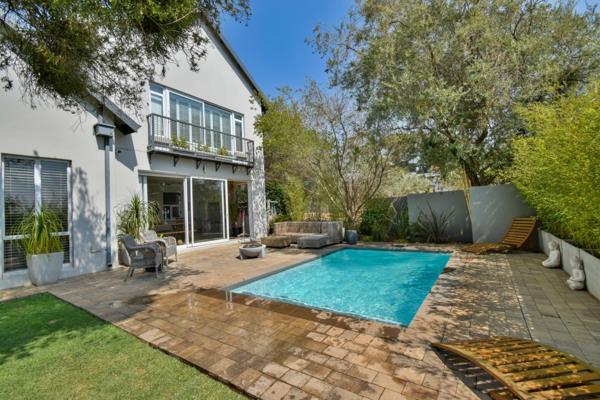 Outdoor living is equally impressive, featuring a private swimming pool, a patio perfect for entertaining, and a balcony offering additional outdoor enjoyment. The property includes a well-maintained garden with an irrigation system, paving, and a driveway leading to two garages and four additional parking spaces. Practical amenities such as staff quarters with outside toilets, a laundry room, and storage enhance daily living. Pets are welcome.