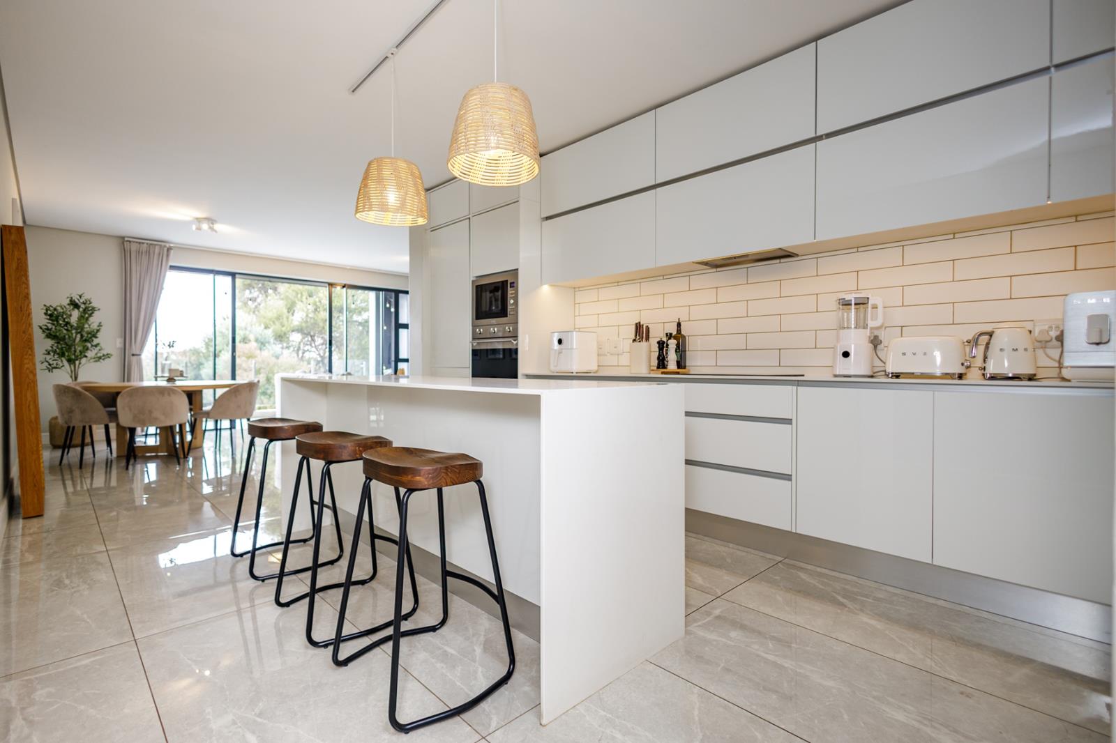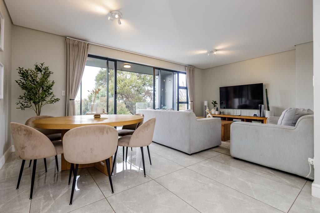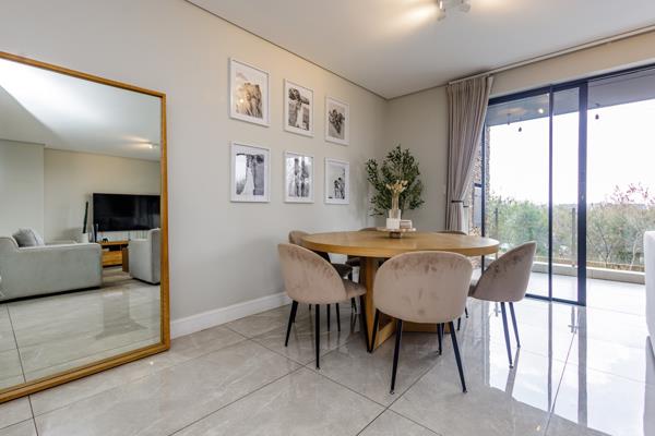 This first-floor gem is surrounded by a tranquil array of trees but still gives you stunning views. As you step into it, the reception area clearly directs you to the living areas on your left and the bedroom areas on your right. Extra cupboards have been added in the kitchen and the glass splashback has been replaced with an awesome tile splashback. The sink tap has been replaced with a beautiful Kessler Matt Black Swivel Sink Mixer. Wrapping up the kitchen area is an island that doubles up as a breakfast knoek if you would like. The dining and lounge areas are adjacent to the kitchen and two sliding doors lead you to an expansive patio that houses a gas braai and opens you to the tranquillity and stunning views that Serengeti Estates is synonymous with.
