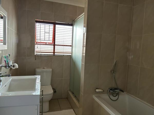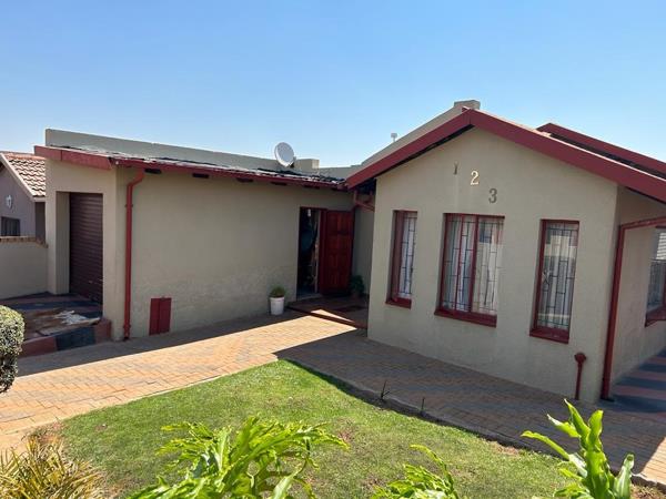 The property presents a neat kerb appeal with its light-colored walls, dark red trim, a well-maintained front lawn, and a paved driveway leading to the integrated single garage. Security is enhanced with burglar bars on windows and security gates, ensuring peace of mind.