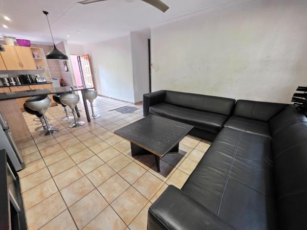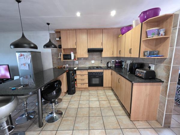 This inviting 123 sqm townhouse in Terenure, Kempton Park, offers a comfortable suburban lifestyle. The open-plan living area seamlessly connects to a functional kitchen, featuring light wood cabinetry, dark countertops, an integrated oven and hob, and a breakfast bar with modern pendant lighting. Tiled flooring extends throughout for easy maintenance and a cohesive feel.