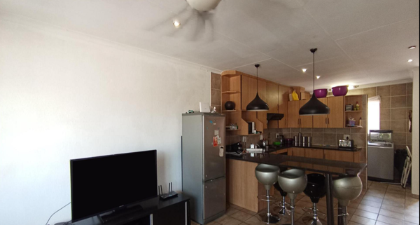 Discover this inviting 3-bedroom, 2-bathroom residence, including one en-suite, located in a secure complex in Terenure, Kempton Park. Spanning 123 square meters, this home offers a practical and comfortable living environment. The interior boasts an open-plan layout, seamlessly connecting the lounge and kitchen areas, ideal for modern living. The kitchen is a focal point, featuring a large island that doubles as a breakfast bar, wood-look cabinetry, a built-in oven and hob, and contemporary pendant lighting. Tiled flooring extends throughout the living spaces, ensuring easy maintenance.