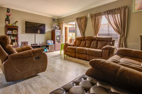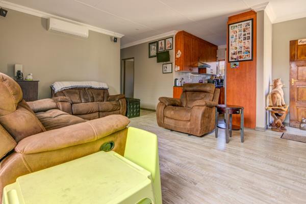 Facebrick cluster home offering 3 bedrooms with laminated flooring and built-in cupboards. 2 Tiled bathrooms, 1 with bath and other with bath and shower. Open plan lounge and kitchen with laminated floors. Lounge with a sliding door leading to the enclosed patio / braai area. Wooden kitchen with built-in cupboards, under counter oven and extractor fan. Laminated patio / braai room with built-in braai.
