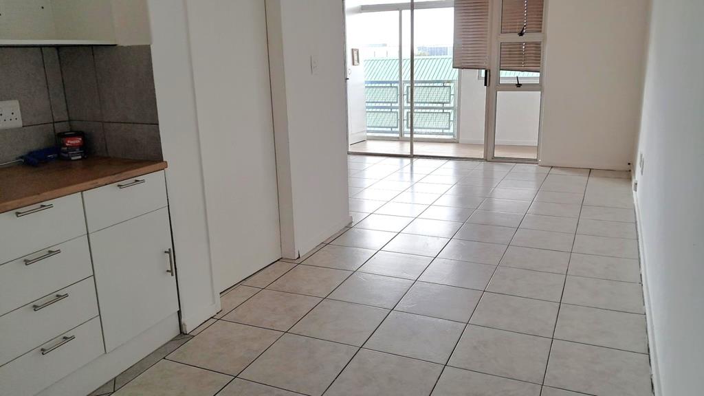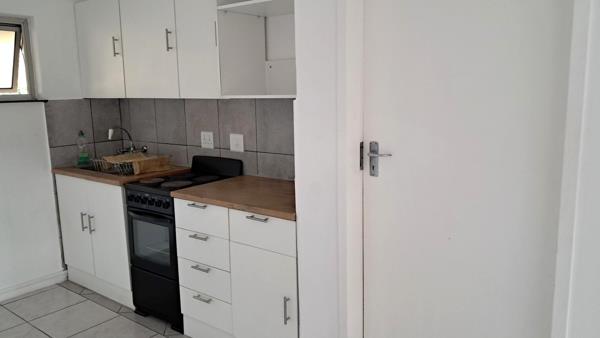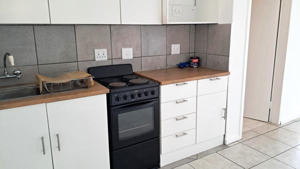 This 1-bedroom, 1 bathroom townhouse features a tiled lounge with built-in cupboards, and a kitchen equipped with a 4-plate stove, oven, and single sink. The bathroom offers a shower, toilet, and basin with space for laundry. The enclosed balcony serves as a bedroom nook with laminated flooring.