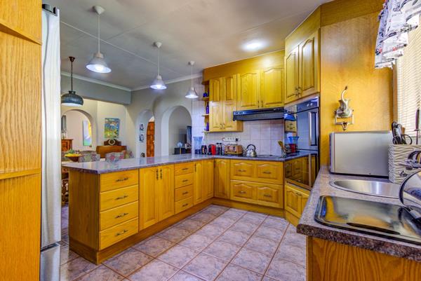 The well-designed kitchen is both spacious and functional, featuring a double eye-level oven with a thermo fan, a two-plate induction stove, and an expansive walk-in pantry with ample shelving. A separate scullery and laundry area include connections for a dishwasher, washing machine, and tumble dryer, as well as a double sink for added convenience.