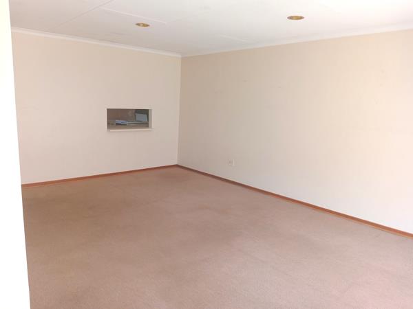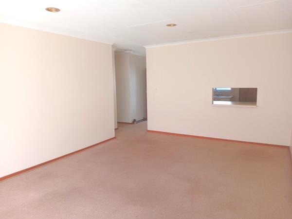 The open-plan lounge and dining room are carpeted, creating a warm and inviting living space. The kitchen includes a four-plate stove and a practical combo scullery with a double basin.