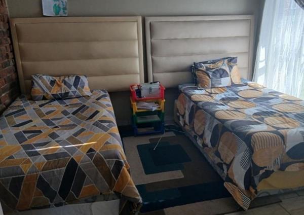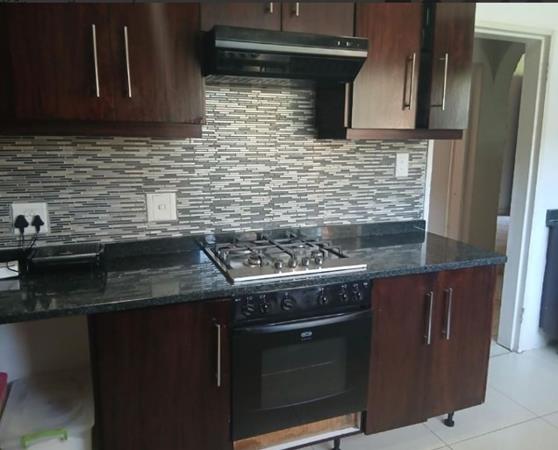 The modern kitchen is designed for both practicality and style, complete with granite countertops, a gas hob, and a pantry cupboard. Flowing effortlessly from the kitchen, the spacious tiled lounge and dining area create a warm and inviting space for everyday family living and entertaining.