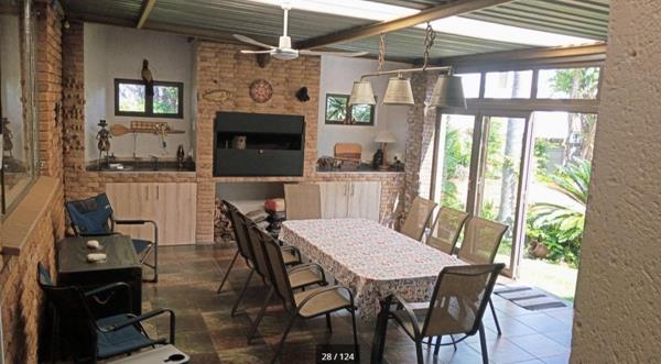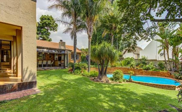 The versatile family room, currently styled as a bar and wine cellar, opens onto a covered patio with a built-in braai, overlooking a newly renovated swimming pool and landscaped gardencreating the ultimate indoor-outdoor entertainment space.