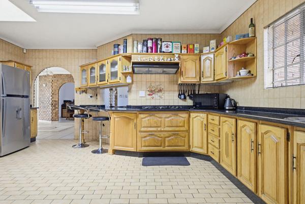 The kitchen, central to the reception rooms, is large & designed for everyday use. Finished with wooden cupboards, it offers generous workspace with a double oven, five-plate gas stove, prep basin & fridge space. The spacious scullery accommodates two under-counter appliances & provides direct access to the garage, keeping the home organised & functional.