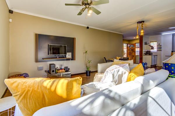 Do you enjoy complex living? Then this is the ideal home for you, with an open plan lounge / dining and kitchen. Laminated floors and ceiling fan in the lounge and dining area with a sliding door leading to the outside. Tiled kitchen with island stove, double eye level oven, pantry, lots of built-in cupboards and under counter space for your electrical appliances. 3 Carpeted bedrooms with built-in cupboards. Large main bedroom with ceiling fan. 2 Tiled bathrooms (1 with shower, other with bath and shower over bath).
