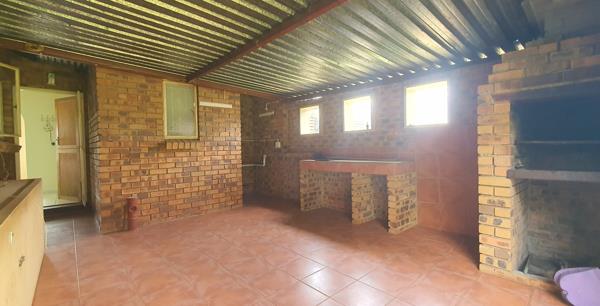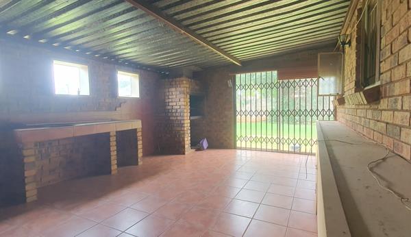 The home features a large Lounge and open-plan Dining area flowing into a well-appointed Kitchen with ample cupboard space. From the kitchen, you enter an additional living area that leads to an enclosed Patio with a built-in Braai, ideal for entertaining. Sliding doors open onto a private garden, perfect for family gatherings and relaxation.