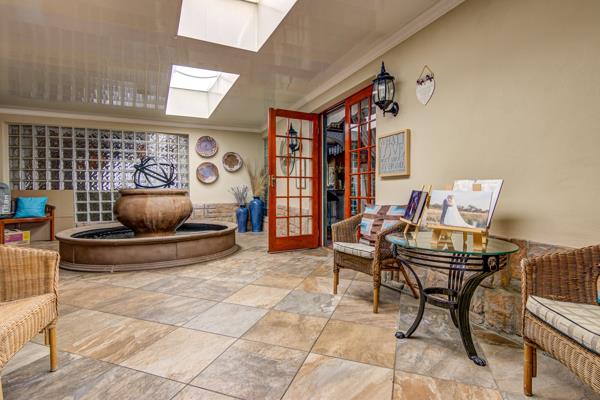 The interior is replete with luxurious features such as air conditioning, blinds, folding doors, and skylights, enhancing the ambiance of grandeur throughout. Outside, the meticulously landscaped garden enchants with its lush greenery and six captivating water features, creating a serene oasis that is perfect for outdoor entertaining. The marbelite pool and baby pool offer refreshing respite on hot summer days, while the covered patio/lounge and braai area provide the ideal setting for alfresco dining.