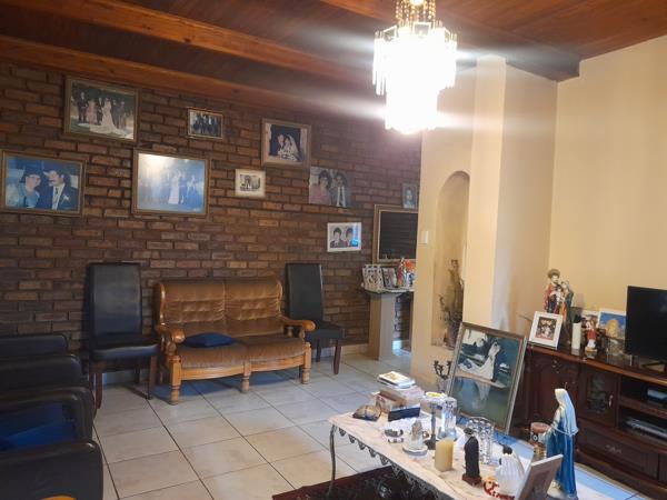 This family home offers 3 large carpeted bedrooms,2 tiled living area,entertainment are with build inn braai stand . large fitted kitchen 2 full bathrooms main bedroom with en-suite modern bath and shower.double garage converted to a bar area it can be easily converted to a 2 bedroom cottage, also have another 2 garage and double carport. a swimming pool and matured garden.