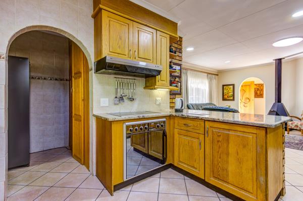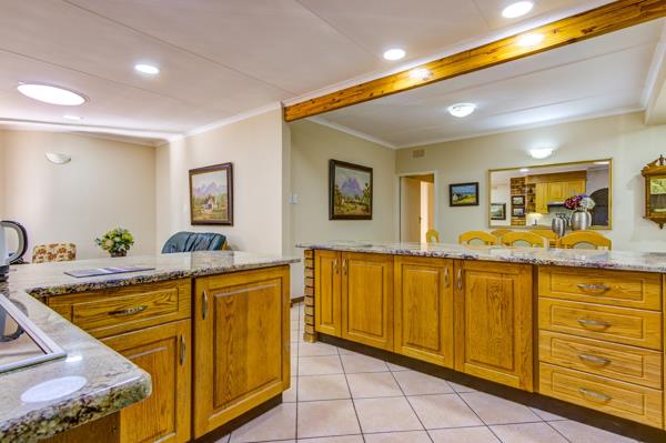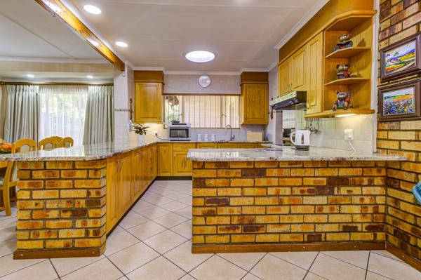 Entertaining is effortless, with a spacious entertainment area that includes a built-in braai, leading directly onto a sparkling swimming pool, well-maintained garden, and a lapa that invites relaxed outdoor living.