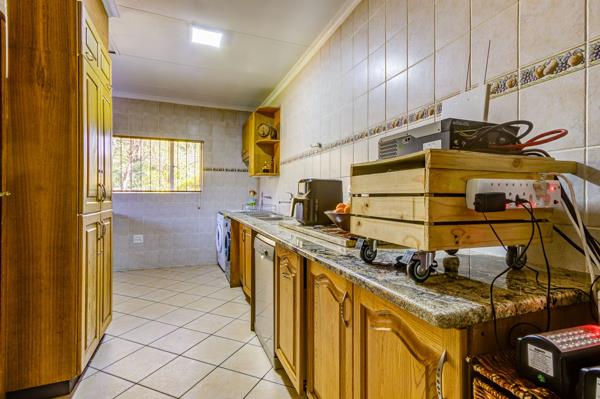 The living areas are open plan and beautifully tiled, seamlessly connecting the lounge, dining room, and kitchen. The kitchen is a true highlight, large and well-equipped, with a separate scullery and pantry that provide plenty of space for storage and preparation. For those cozy winter evenings, a fireplace adds warmth and charm to the home.