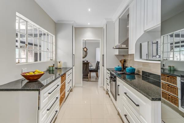 Located in a highly secure boomed-off area with 247 guarded access and street cameras, the property offers top-tier security and complete peace of mind. The home features four sunny, comfortable bedrooms with laminate flooring, as well as a study that can easily be converted into a fifth bedroom if needed. Three beautifully renovated modern bathrooms add to the homes appeal, while the open-plan dining and lounge area boasts stylish tiles and contemporary light fittings. The modern kitchen includes granite countertops, a separate scullery, and ample cupboard space, making it both functional and elegant.