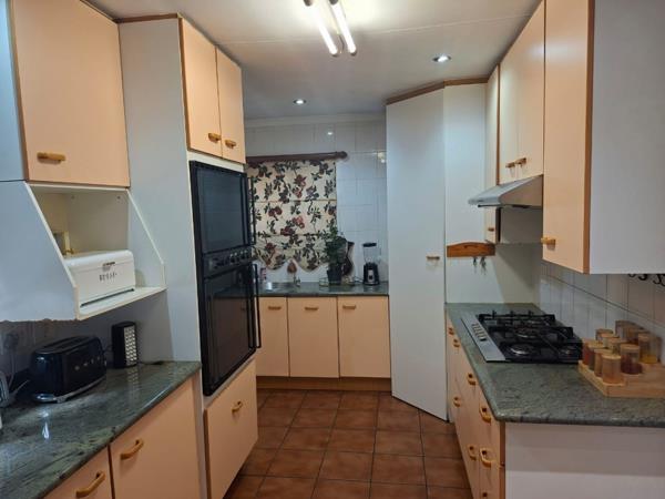 This property features a fully tiled kitchen for seamless cleaning, it boasts a practical scullery area, perfect for laundry tasks. The heart of the kitchen is the cooking area, featuring a gas stove and oven, making meal prep a breeze.