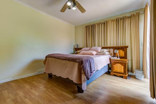 The home offers four large bedrooms, all generously sized, with two bedrooms fitted with ceiling fans and laminated flooring.