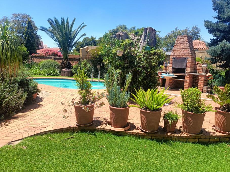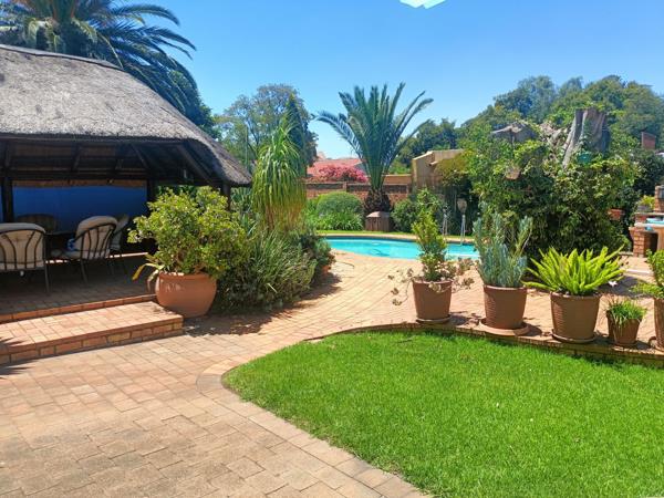 Set on a generous 1,404 m² stand, the property offers three bedrooms, a sunny enclosed patio, home office, laundry, and a versatile extra-large room ready to become a second lounge, studio, or hobby space. Outside, enjoy a private garden, sparkling pool, ample parking, and multiple garages.