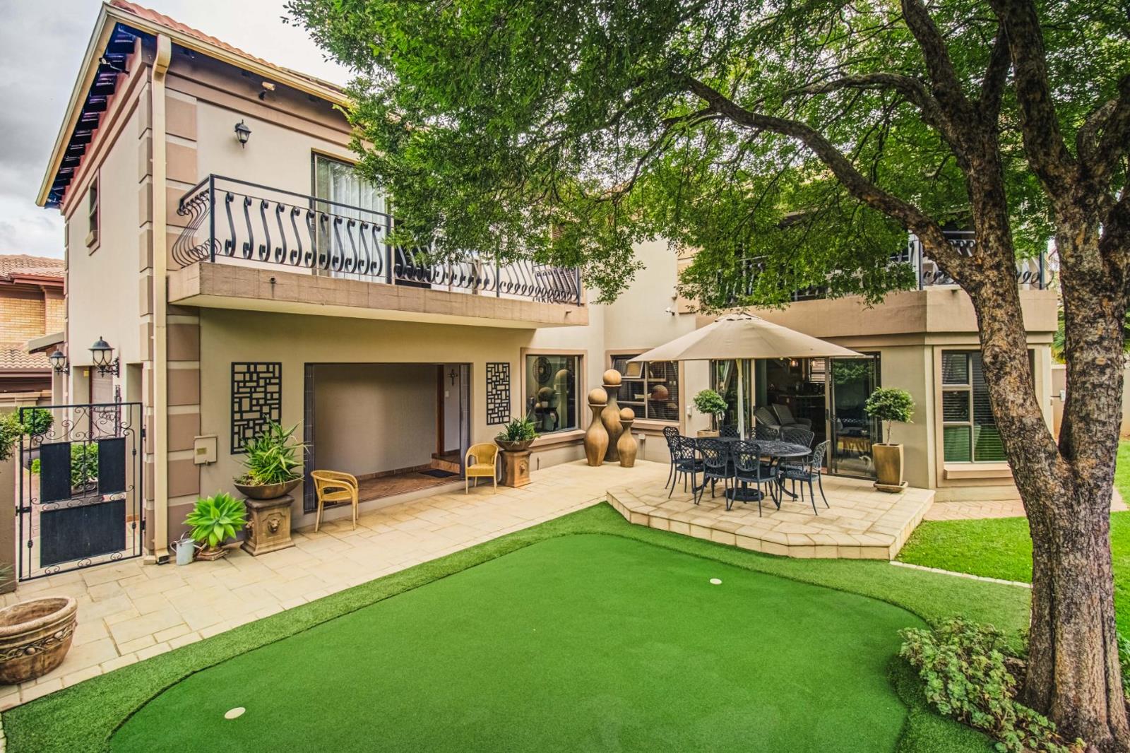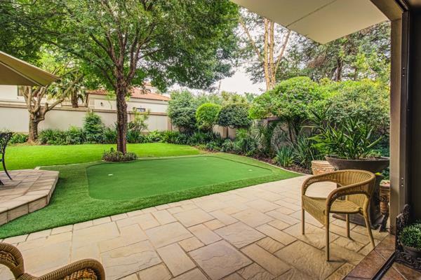 Enjoy sunset views from the covered patio on the top floor, overlooking a lush private garden complete with a putting green. The 757m² stand offers ample outdoor space, complemented by three automated garages. The estate itself is a peaceful haven, with meandering paths leading to streams where ducks waddle and benches invite quiet reflection.
