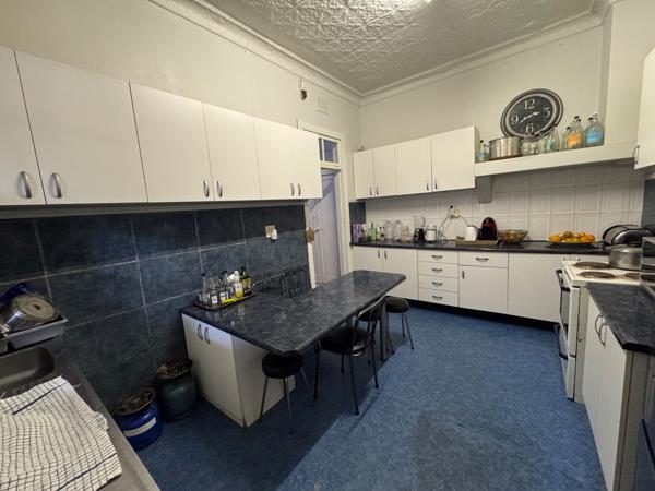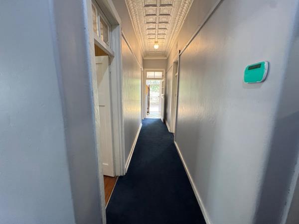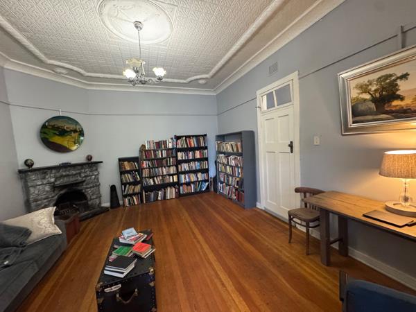 This charming home features 3 bedrooms, 2 bathrooms, and a self-contained flatlet with a kitchen, bedroom, and garage. The interior showcases high ceilings, wooden floors, and a cozy fireplace.
