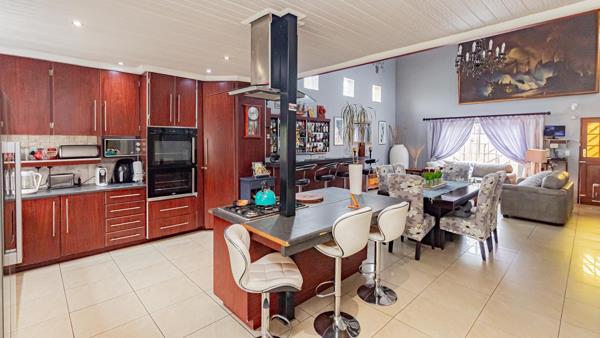 Modern Kitchen: Equipped with a gas hob, extractor fan, eye-level oven, and breakfast nookcenter island. A sliding door opens to a covered patio featuring a built-in braai in the private backyard.