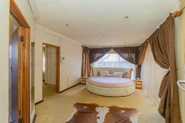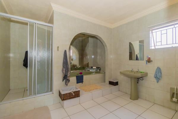 A few steps down leads to a generously sized study, fitted with built-in cabinetry for files. On the same level, you will find the impressive double-volume main bedroom, featuring a walk-in dressing room and a luxurious en-suite bathroom with a bath, shower, basin, and toilet. The main bedroom is carpeted and opens through sliding doors to a private jacuzzi area, which is complemented by an additional bathroom and changing room.