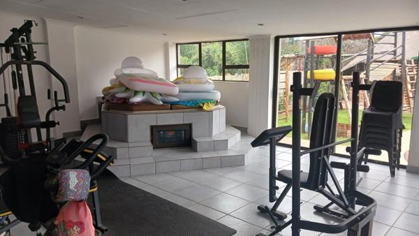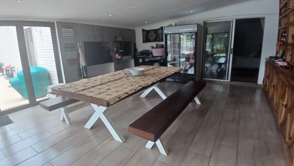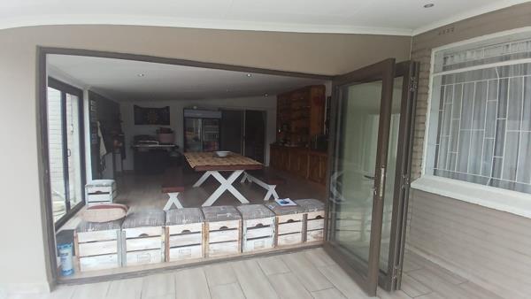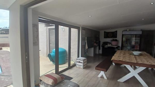 entertainment room have built in braai, built in cupboards and tiled floors with large stacker glass door opening