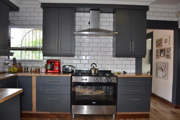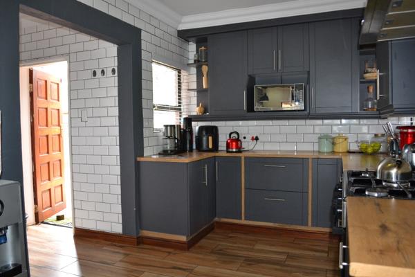 Just off the kitchen, a spacious scullery provides additional storage and workspace, complete with built-in cupboards, a double sink, and connections for appliances, including space for a double-door fridge.