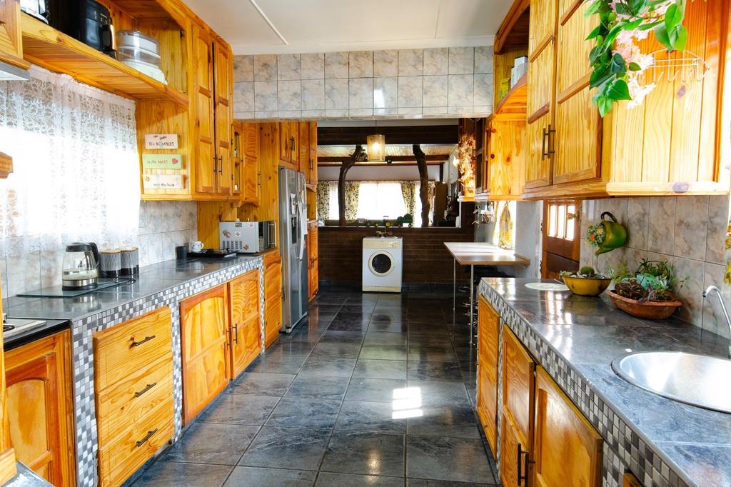 The kitchen is both practical and welcoming, featuring classic wooden cabinetry, a gas hob, electric eye-level oven, and a separate scullery for added convenience.