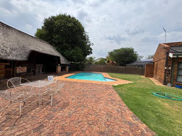 Step outside to your private retreat, a heated swimming pool surrounded by a large paved entertainment space and a charming lapa with a built-in braai and bar area, ideal for hosting family and friends.