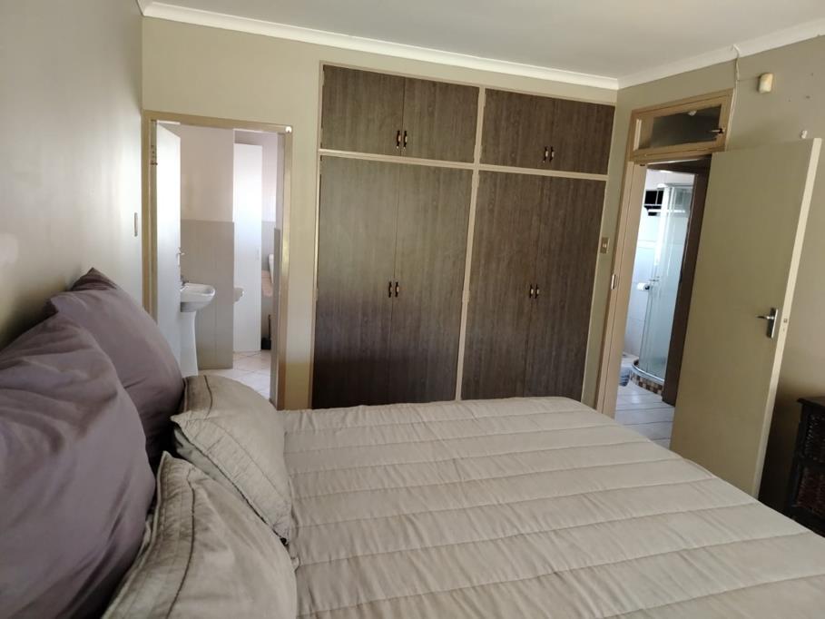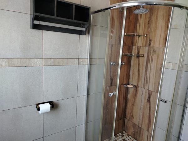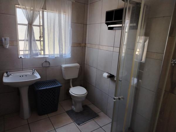 This home offers three well-proportioned bedrooms, each featuring tiled flooring, built-in cupboards, and ample natural light from large windows, some with garden views. There are two bathrooms, including one ensuite, ensuring convenience. One bathroom boasts a modern glass-enclosed shower with wood-effect tiling and a rain showerhead, while the other provides a functional shower and pedestal sink.