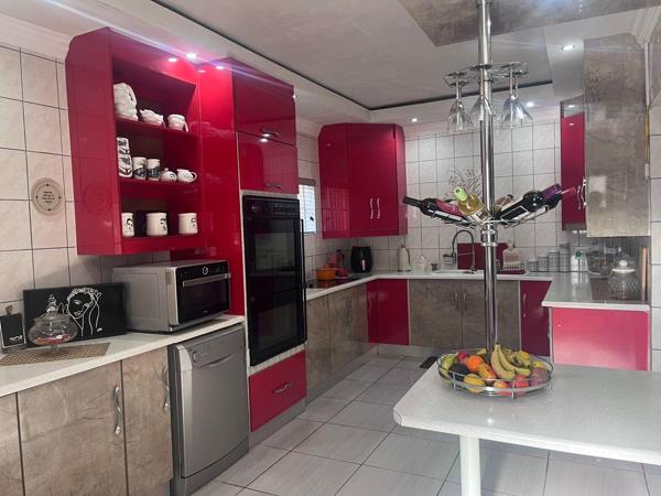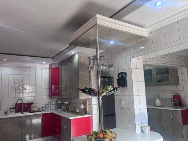 The search is over, welcome to your upmarket modern design home in Nigel. Step into a captivating entrance hall leading you to a spacious main lounge on the left and another lounge on the right which can be used for the kids. Exclusive wall painting and immaculate wall artwork features in every room entertwined with stunning down lights on the ceiling. Glass door separates the main lounge with the dining area where your big family can be accommodated.