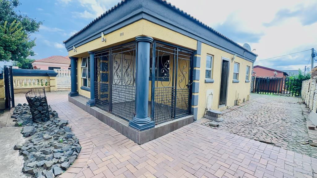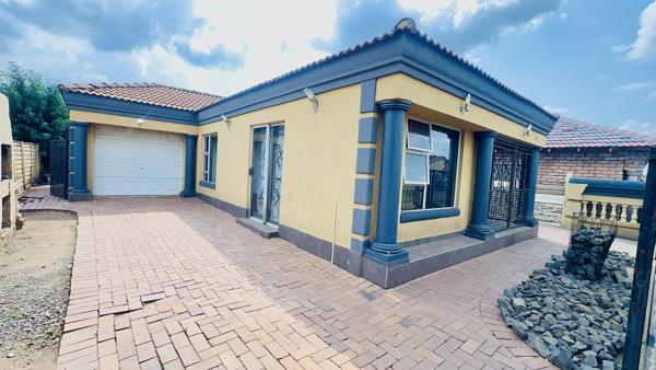 The inviting lounge is generously sized and opens through a sliding door to a built-in braai area, making it ideal for entertaining guests. An additional entrance with a stylish pivot door leads to a covered patio secured with security gates for added peace of mind.