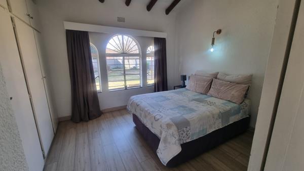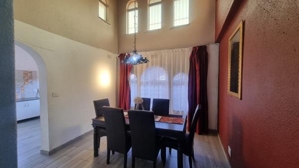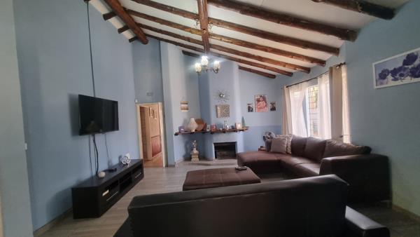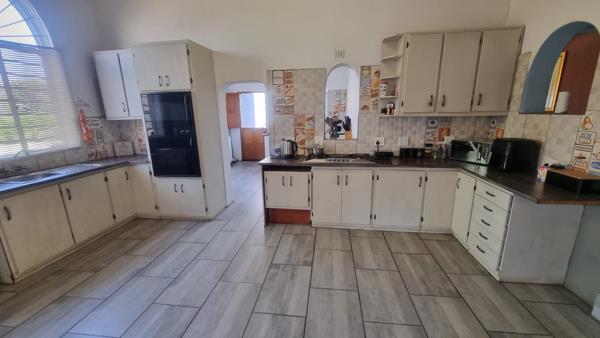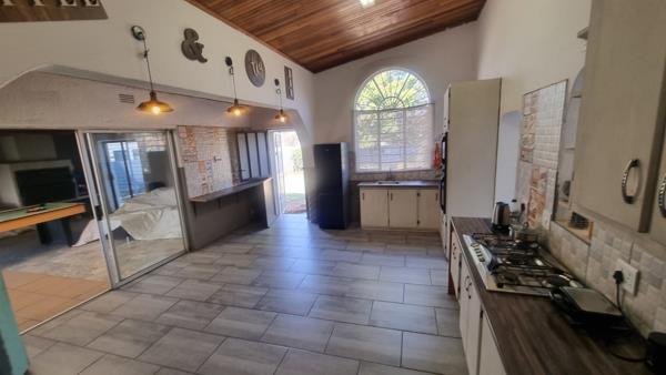 The spacious kitchen features ample cupboard and workspace flowing into a comfortable lounge and dining area. A large entertainment room with a built-in braai is perfect for gatherings.