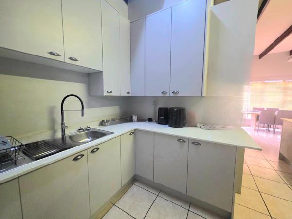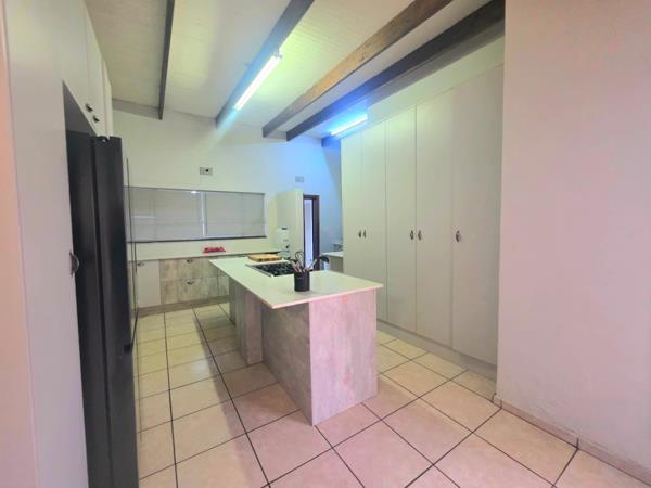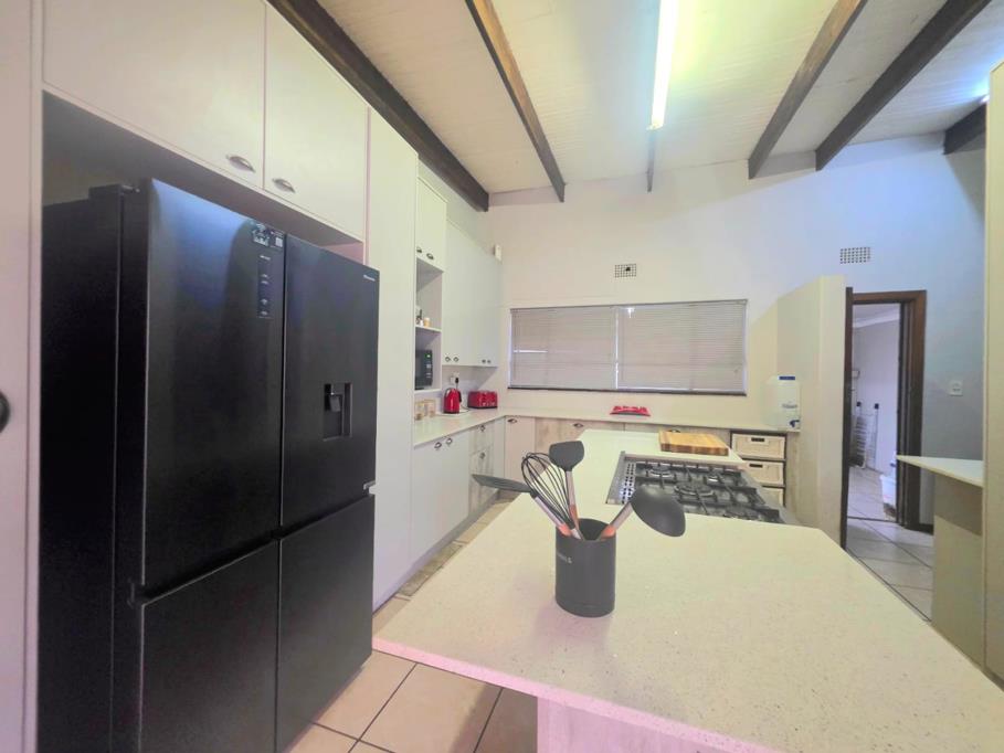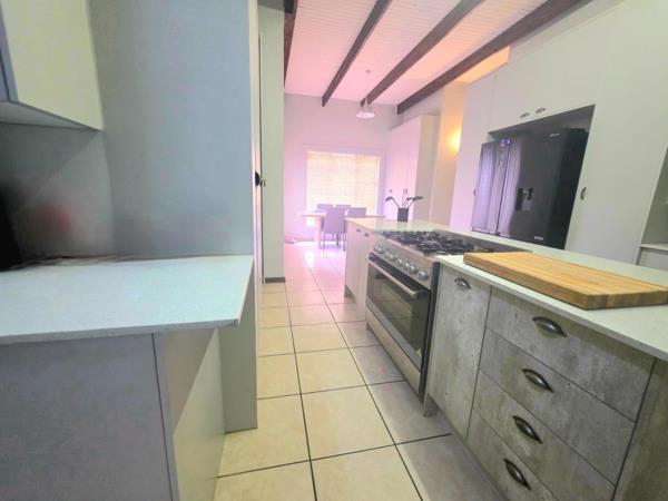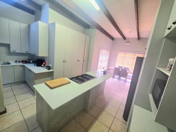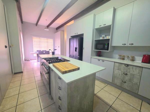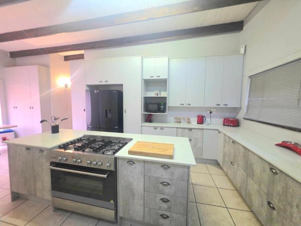 Modern kitchen with ample cupboards, 5-plate gas stove, electric oven, scullery and atrium.